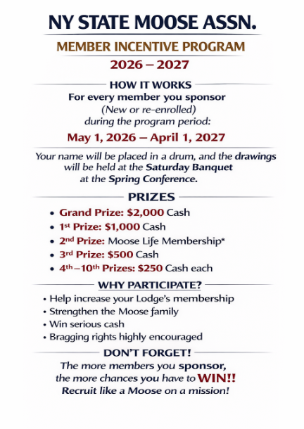 IMPORTANT NOTICE: The Loyal Order of Moose is a private organization. All activities and events referred to on this website and the Moose newsletter are available to members in good standing and their qualified guest. This website is for informational purposes with proprietary information intended for members only. General information is available to the public at large, but should not be construed to be a solicitation for membership. This website is an initiative of the New York State Moose Association and is not sanctioned by the Loyal Order of Moose International or any subsidiary thereof. All logos, trademarks and service marks pertaining to the LoyalOrder of Moose and or its programs or degrees are copyrighted by Moose International, Inc. Mooseheart, Illinois.